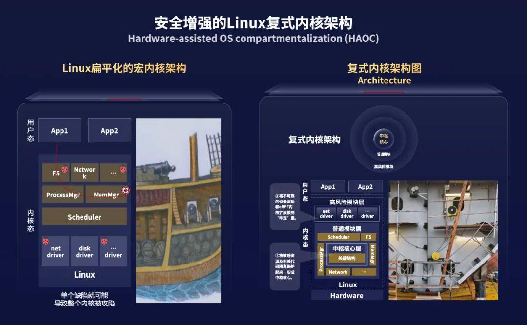 中關村實驗室研究員、中國科學院計算技術研究所研究員武成崗,在操作系統大會2024上的主題演講中打了一個形象比喻:“扁平化的宏內核架構像古代的戰艦一樣,攻擊者很容易完成攻擊,而複式內核更像現在的航母,裏面有很多艙,有了艙以後,想實施攻擊就變得很難。”