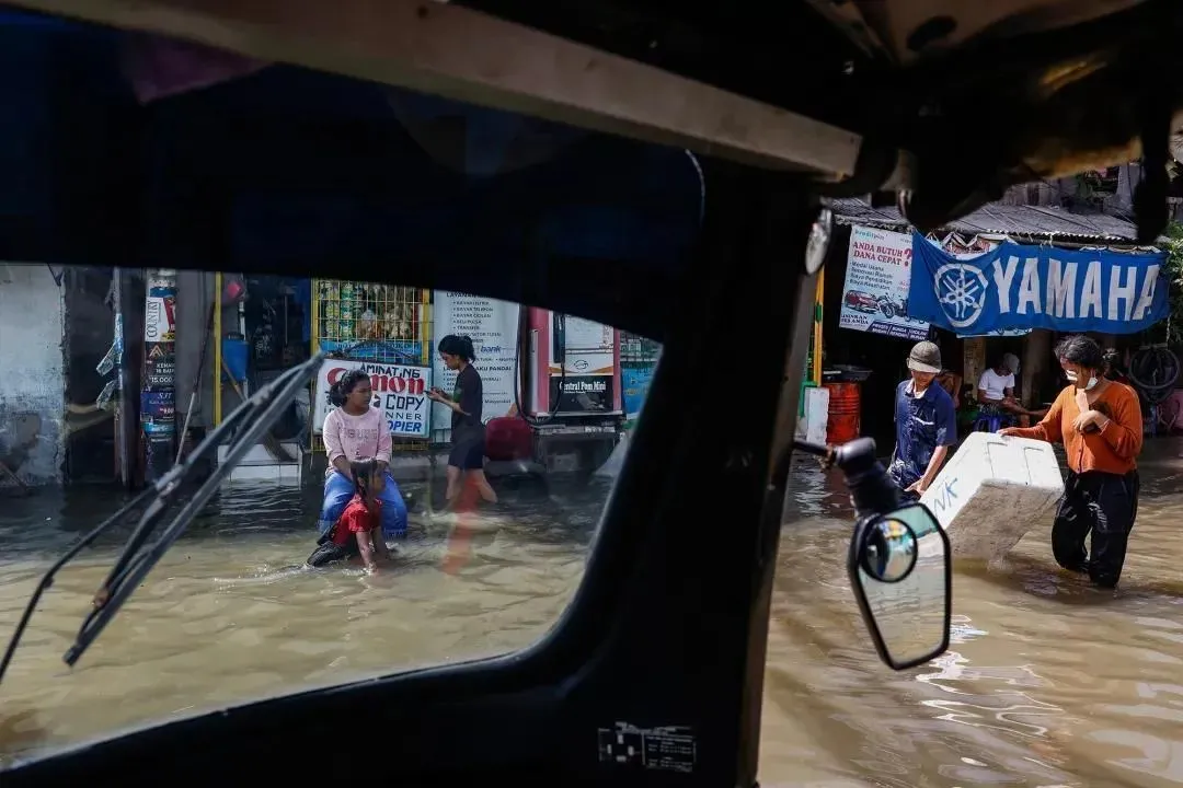 2021年11月9日,雅加達,人們在漲潮的洪水中涉水。