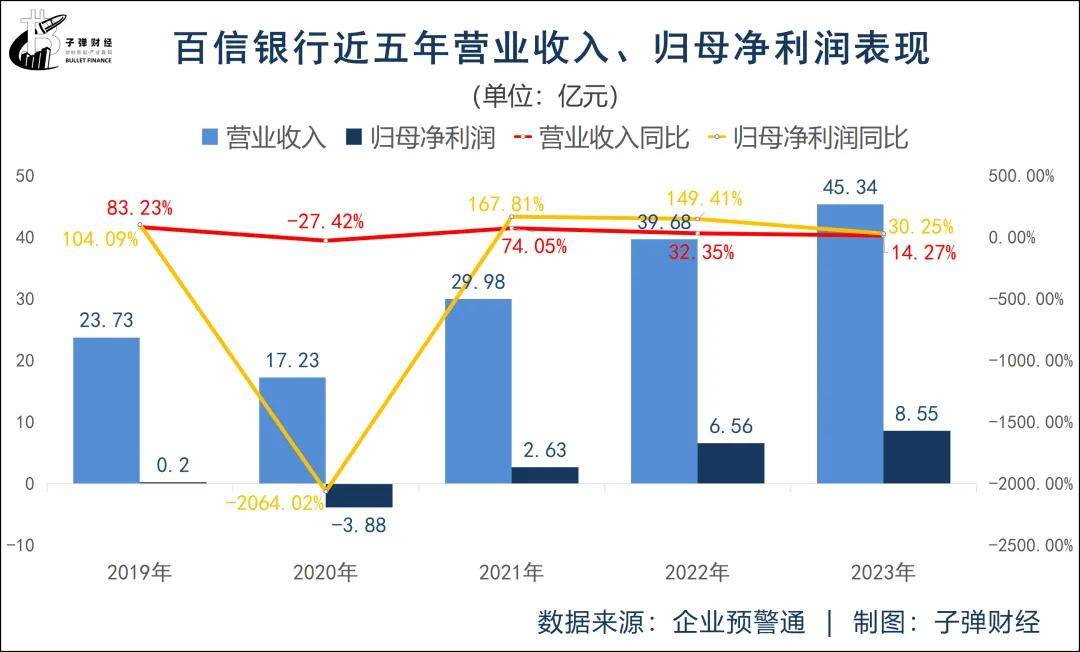 2021年,百信銀行再次實現扭虧。2021年至2023年,百信銀行分別實現營業收入29.98億元、39.68億元及45.34億元,同比增長74.05%、32.35%及14.27%;分別實現歸母淨利潤2.63億元、6.56億元和8.55億元,同比增長167.81%、149.41%和30.25%。