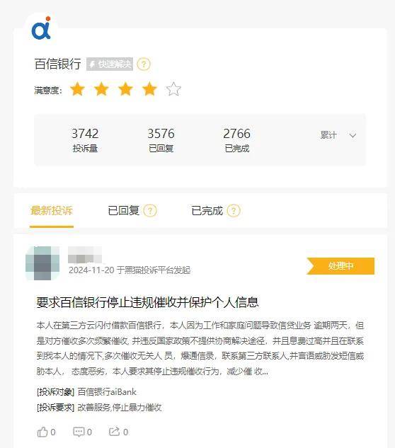 黑貓投訴顯示,百信銀行的消費者投訴量一直居於高位。截至11月20日,百信銀行消費者投訴量超3700條,近30天投訴量就有84件,投訴問題包括暴力催收、無感開通、私自劃扣款項等。