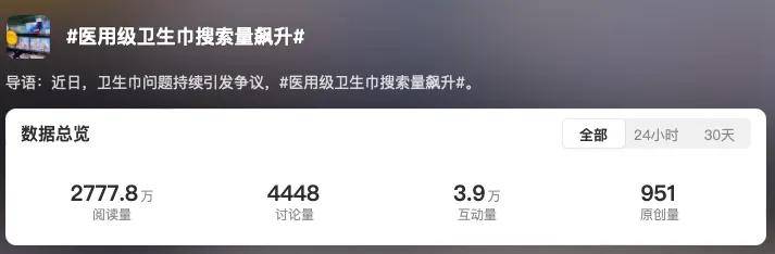 比如,今天的另一條熱搜顯示,在衞生巾行業的一系列醜聞被曝出後,醫用衞生巾的搜索量飆升。