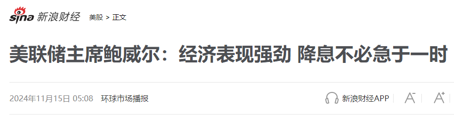 11月14日週四,美聯儲主席鮑威爾稱不需要急着降息,市場認為,這是在暗示12月可能不會降息。鮑威爾表示,由於美國經濟最近的表現“非常強勁”,美聯儲不需要“急於”降低利率,將仔細觀察以確保某些通脹指標保持在可接受的範圍內。在接近所謂的中性利率水平時,央行可能會放慢降息步伐。