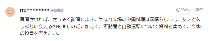 如果重新開放的話,我想馬上去中國遊玩,畢竟地道的中國菜很棒,我也很期待和朋友久別重逢。另外,我還收集了房地產和自動駕駛的資料,想考慮一下到今後到那邊去投資。