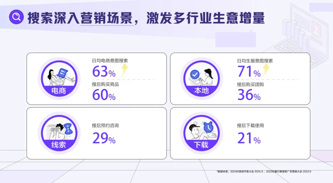 同時,搜索與商家生意的關聯愈加緊密,抖音用户的日均電商意圖搜索增長了63%,生活服務意圖搜索增長了71%,而且用户的搜索動作很多都導向各種消費行為——60%用户在抖音有過搜索後購買商品的行為,36%用户在搜索後購買過團購類商品,29%用户有過搜索後預約諮詢,21%用户有過搜索後下載使用。