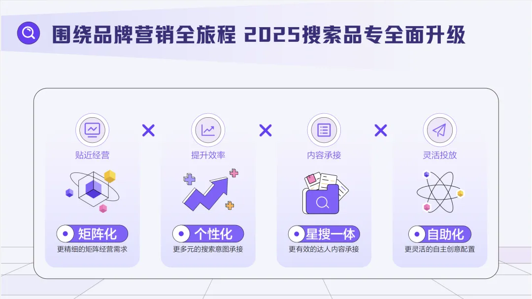 與以上四大趨勢相呼應,巨量引擎搜索品專在2025年將圍繞品牌營銷全旅程,從矩陣化、個性化、星搜一體、自助化四個方向進行升級,讓搜索品專“有搜必現、承接必需、經營必選”三大核心價值得到更好的發揮和利用。