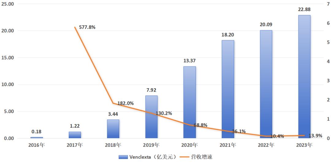 維奈克拉是目前唯一一款上市的細胞凋亡療法藥物,一經上市即獲得了投資者的熱切關注,並且不負眾望的成為營收超20億美元的重磅藥物。艾伯維2023年報顯示,維奈克拉營收達22.88億元,同比增長13.9%。