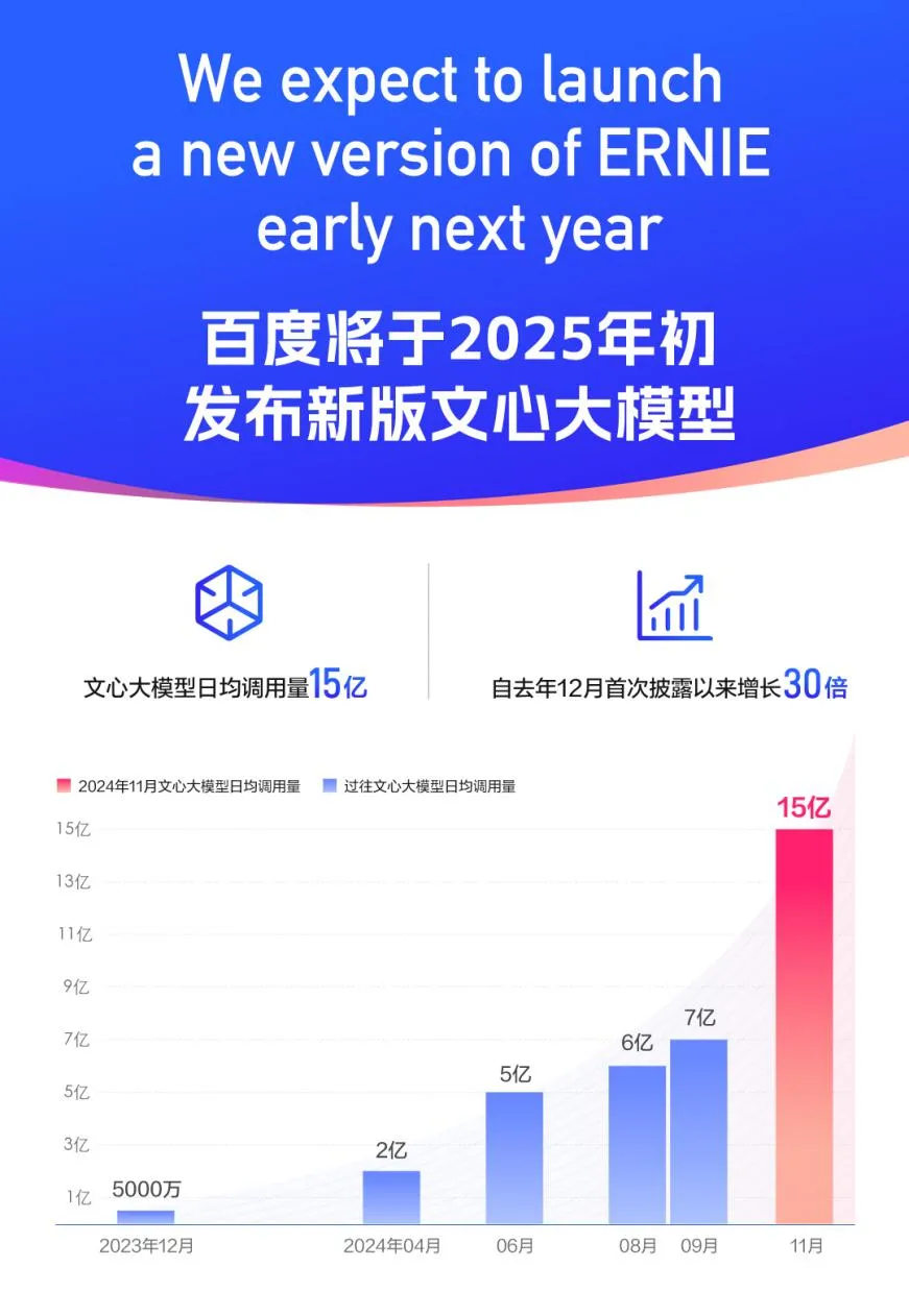 財報電話會上,李彥宏透露,2025年初,百度將發佈文心大模型的新版本,以鞏固在基礎模型上的領先優勢。