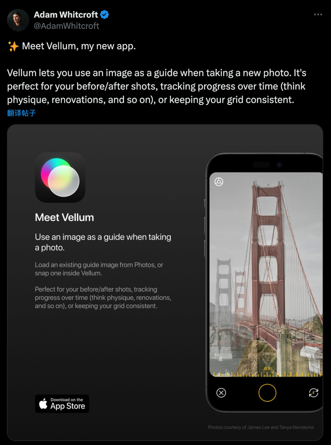 前幾天,我刷到一個開發者推出一款叫 Vellum 的拍照軟件。這軟件可以 “ lets you use an image as a guide when taking a new photo ” 。