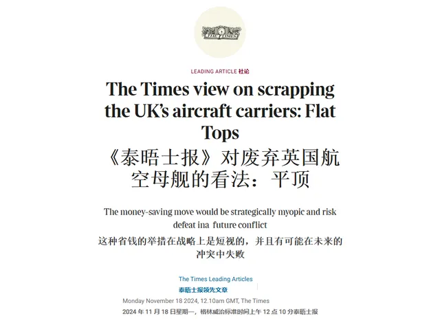 這兩天我在小不列顛快沒北愛爾蘭聯合不起來王國的老牌媒體,《泰晤士報》上刷到了一篇賊搞笑的文章,説是英國國防部與財政部的官員最近舉行了一次會議,後者提出訴求,希望能將英國海軍現役的兩艘“女王級”航母給“砍掉”一艘。