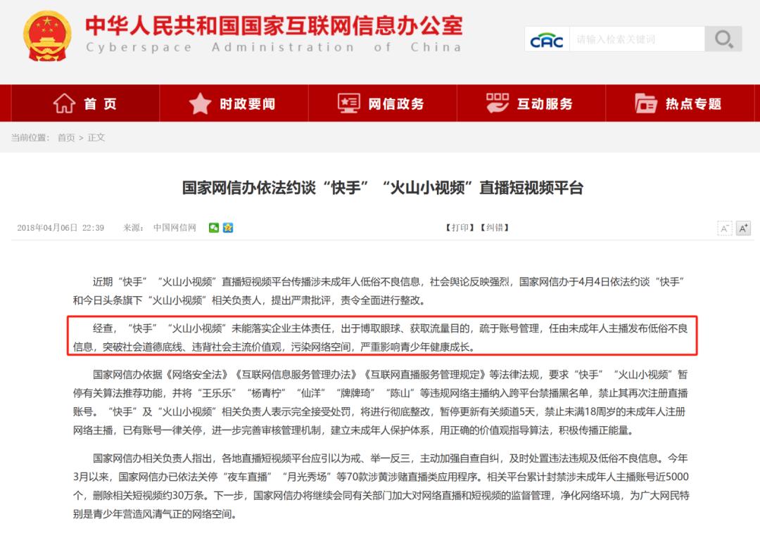 國家網信辦官網顯示,因被指傳播涉未成年人低俗信息,2018年4月,國家網信辦依法約談“快手”“火山小視頻”直播短視頻平台負責人。