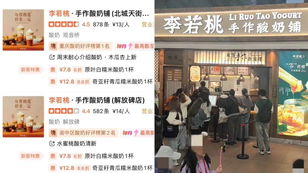 一個叫李若桃手作酸奶鋪(以下簡稱李若桃)的品牌,憑藉“白糯米+酸奶”快速走紅,登上大眾點評酸奶好評榜Top1,接連開出12家直營門店,被網友視為“重慶酸奶天花板”。