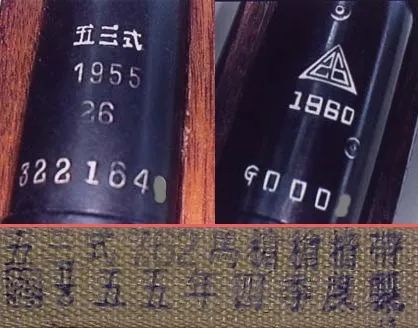 ▲早期槍上刻有“五三式”字樣(左),後期改為296廠標誌(右),槍揹帶上也印有字跡(下)。53步槍在1960年停產,大約生產了100多萬支。