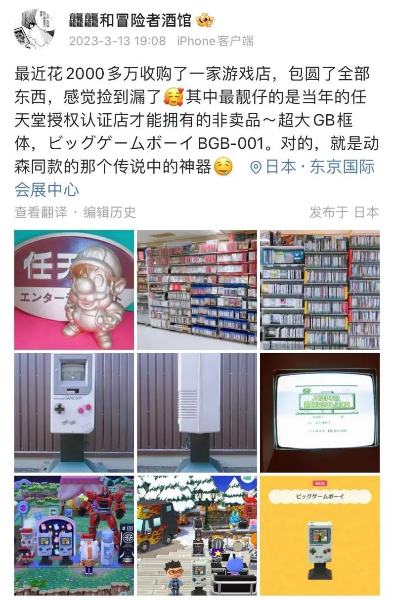 《芙哇芙哇女僕咖啡廳》製作人的微博ID叫作“龘龘和冒險者酒館”,去年他曾在發博文提到自己收購了一家日本中古遊戲店,撿漏不少珍貴“道具”,包括九十年代任天堂發給授權店的金色馬里奧雕像、超大GB框體Big GameBoy-001等等。