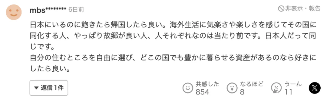 “如果你在日本玩膩了,你可以回國。不言而喻,有的人在國外生活安逸,而有的人畢竟更喜歡家鄉,每個人都是不同的。對於日本人來説也是如此。如果可以自由選擇想要居住的地方,並且擁有在任何國家舒適生活的資產,那麼其實你應該做任何喜歡的事情。”