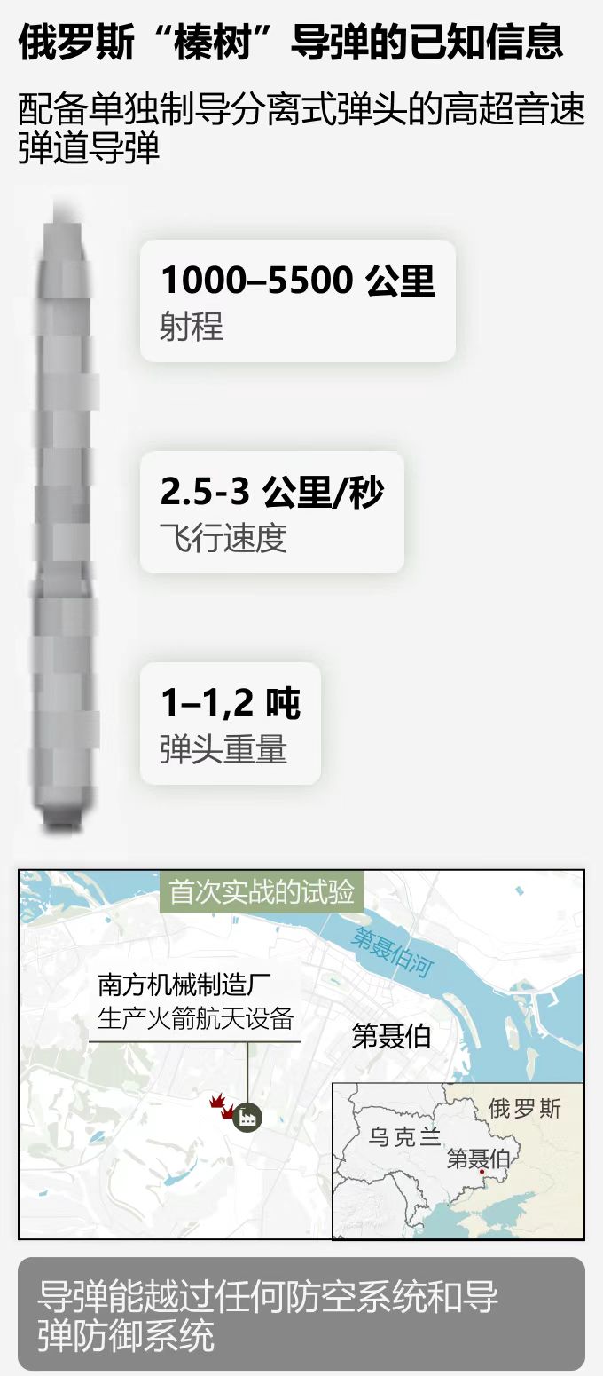俄羅斯外交部部長拉夫羅夫之前稱"烏克蘭使用遠程導彈打擊俄羅斯將被視為西方對莫斯科戰爭的新階段,俄羅斯將採取相應行動"。話音剛落,俄羅斯就向烏克蘭發射了處於測試階段的奧列什尼克(榛樹) 導彈。