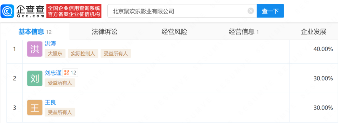 一般説來,影片備案公司就是主控公司,但在實際上映之時,良友影業成為了16家聯合出品公司之一。主控方變成了中影、聚歡樂、貓眼,發行是貓眼、中影、萬達、超樂無限,宣發則是貓眼、票房大賣和庫布里克。除此之外,還有萬達、酷鯨、無限自在等知名影企參投。唯一一個“非著名”公司聚歡樂在今年5月才正式成立,股東為洪濤、劉忠謹、王良三人,其中王良佔股30%。