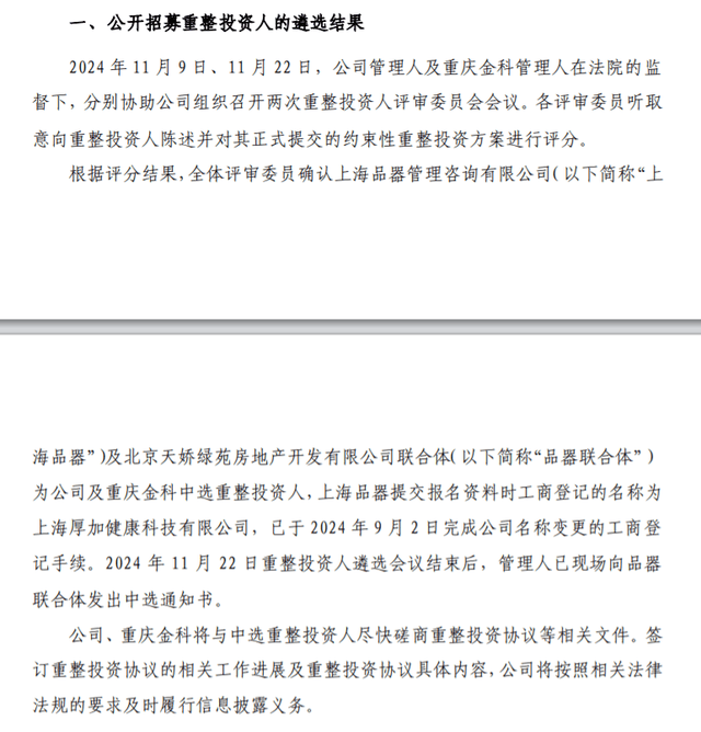 根據金科股份11月22日晚間發佈的公告,在當日召開金科股份及重慶金科重整投資人遴選評審會第二次會議上,經過評審委員現場評分和最終排序,確定了上海品器管理諮詢有限公司及北京天嬌綠苑房地產開發有限公司聯合體(以下簡稱“品器聯合體”)為公司及重慶金科中選重整投資人。