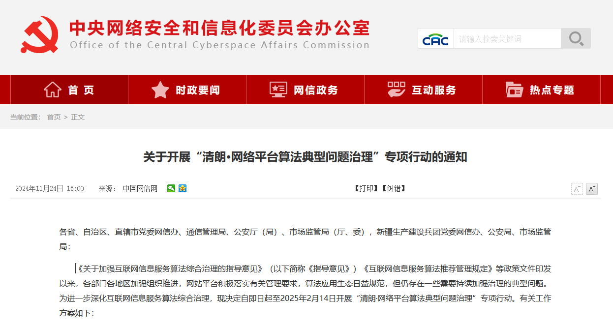 為了進一步深化互聯網信息服務算法綜合治理,中央網信辦等四部門決定自2024年11月24日起至2025年2月14日,開展“清朗·網絡平台算法典型問題治理”專項行動。此次專項行動旨在聚焦網民關切,重點整治同質化推送營造“信息繭房”、違規操縱干預榜單炒作熱點、盲目追求利益侵害新就業形態勞動者權益、利用算法實施大數據“殺熟”、算法向上向善服務缺失侵害用户合法權益等重點問題。