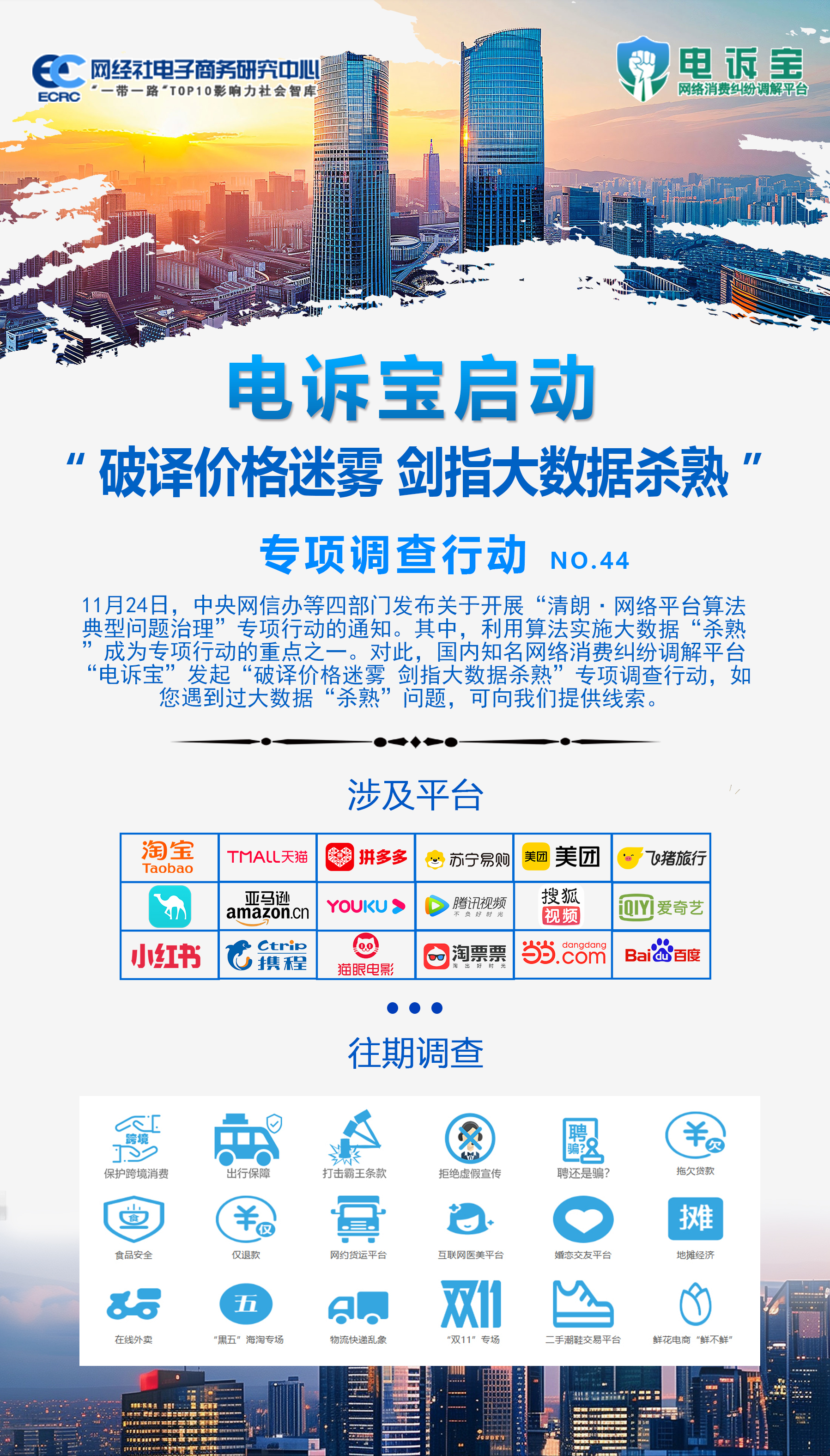 為保護消費品合法權益,避免調入大數據“殺熟”陷阱,網絡消費糾紛調解平台“電訴寶”發起“破譯價格迷霧 劍指大數據殺熟”專項調查行動。本次調查行動主要涉及的對象包括但不限於:淘寶、天貓、亞馬遜、美團、小紅書、蘇寧易購、噹噹網、拼多多、飛豬、攜程、去哪兒、貓眼、淘票票等。