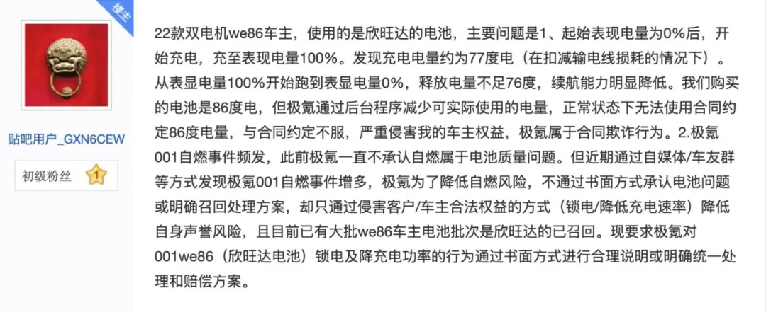 在百度貼吧極氪001吧,貼吧用户_GXN6CEW發帖説,他是22款雙電機WE86車主,通過充放電發現,在扣減輸電線損耗的情況下,表顯充電電量約77度,釋放電量不足76度,極氪通過後台程序減少可實際使用的電量,正常狀態下無法使用合同約定的86度電量,嚴重侵害車主權益。