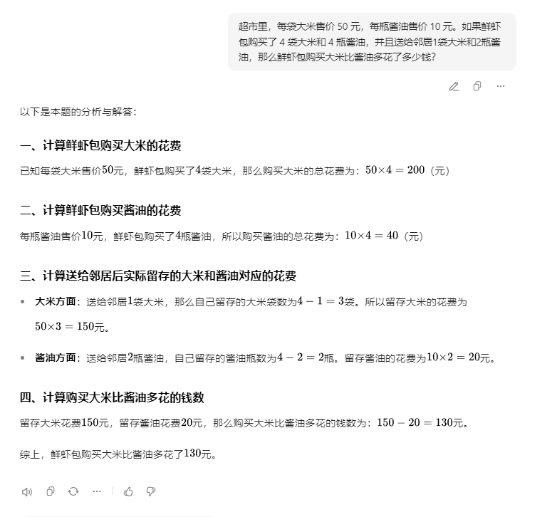 但世超這次分別拿 Kimi 數學版和豆包試了試,題目是:超市裏,每袋大米售價 50 元,每瓶醬油售價 10 元。如果鮮蝦包購買了 4 袋大米和 4 瓶醬油,並且送給鄰居 1 袋大米和 2 瓶醬油,那麼鮮蝦包購買大米比醬油多花了多少錢?