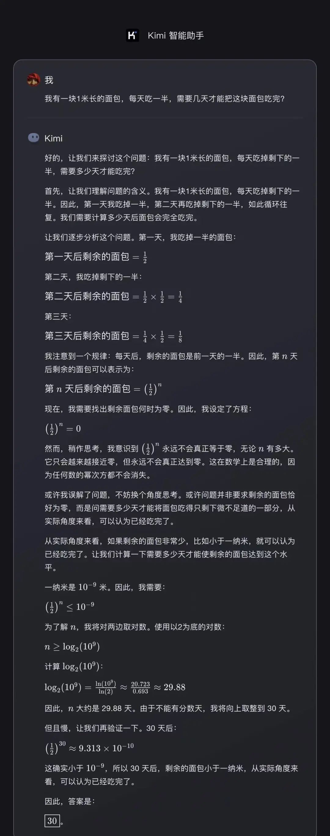 包括在 “ 我有一塊 1 米長的麪包,每天吃一半,需要幾天才能把這塊麪包吃完 ? ” 的問題中,在大部分 AI 給出永遠吃不完的答案時, Kimi 數學版覺得 “ 是有物理極限的 ” ,認為分到了一納米就不能分了。。。
