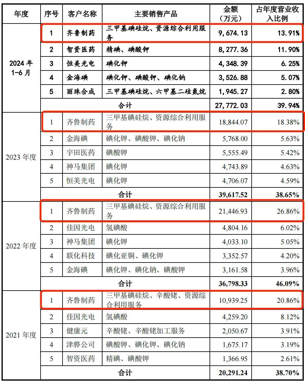 而且,從其他客户的銷售規模看,2021年-2023年,銷售額超過億元的客户有且僅有齊魯製藥一家,2024年上半年,博苑股份對齊魯製藥的銷售額就已經近億元。