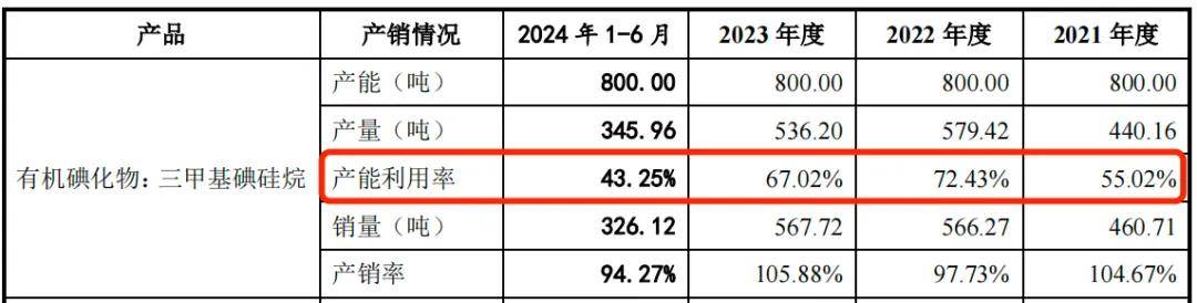此外,博苑股份目前主要的有機碘化物是三甲基碘硅烷,報告期內產能利用率分別為55.02%、72.43%、67.02%和43.25%,自2022年開始該產品的產能利用率便逐年下降。