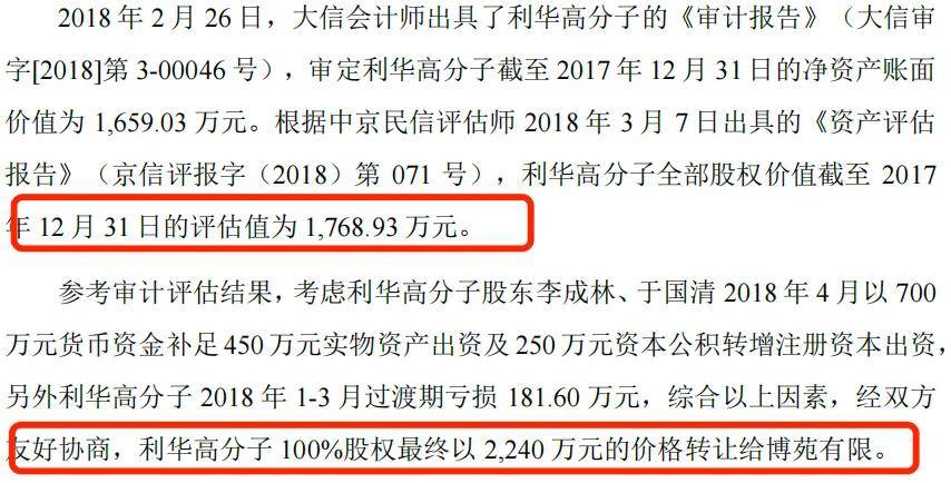 2018年4月,因看好利華高分子的主營業務高效減水劑,博苑有限以2240萬元的價格收購利華高分子100%股權。然而,根據評估,2017年12月31日,利華高分子全部股權價值的評估值為1768.93萬元。