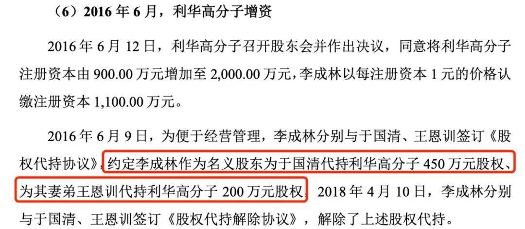 2016年6月12日,利華高分子的股東會議作出決定,將公司的註冊資本增加1100萬元,新增部分由李成林以1元/註冊資本的價格認繳。就此,利華高分子成為博苑有限的關聯企業。不僅如此,李成林還代於國清和王恩訓分別持有450萬股權和200萬股權。