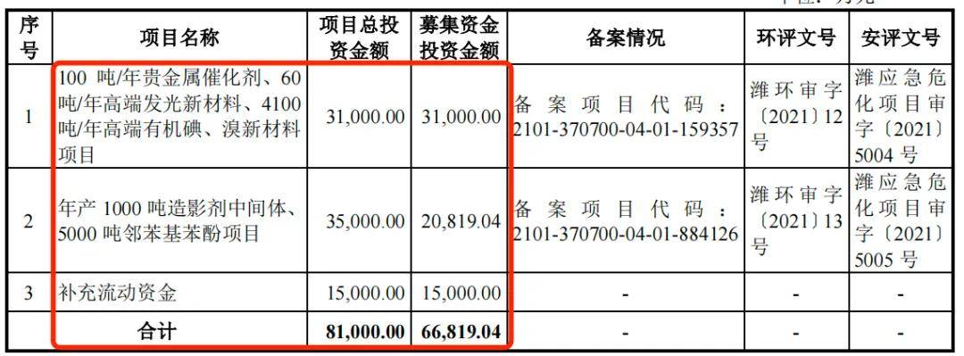招股書顯示,博苑股份本次擬募集資金6.68億元,其中3.1億元投向100噸/年貴金屬催化劑、60噸/年高端發光新材料、4100噸/年高端有機碘、溴新材料項目;2.08億元投向年產1000噸造影劑中間體、5000噸鄰苯基苯酚項目;1.5億元用於補充流動資金。