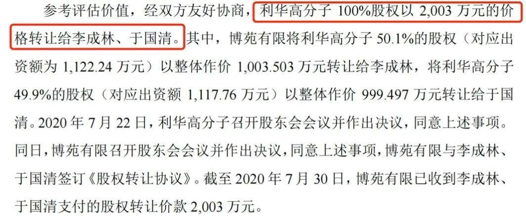 2020年7月,利華高分子100%股權以2003萬元的價格轉讓給李成林和於國清,這一價格較兩年前的收購價格2240萬元已經縮水。其中,李成林出資1003.503萬元,於國清出資999.497萬元。