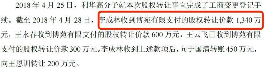 也就是説,博苑有限以高出評估價格471.07萬元的價格收購利華高分子。其中,李成林收到博苑有限支付的股權轉讓價款1340萬元,收款後向於國清轉賬450萬元,向王恩訓轉讓200萬元。