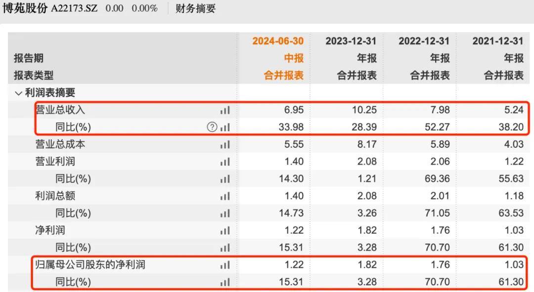 2021年-2024年上半年(以下簡稱“報告期”),博苑股份的營業收入分別為5.24億元、7.98億元、10.25億元和6.95億元;同期歸母淨利潤分別為1.03億元、1.76億元、1.82億元和1.22億元。