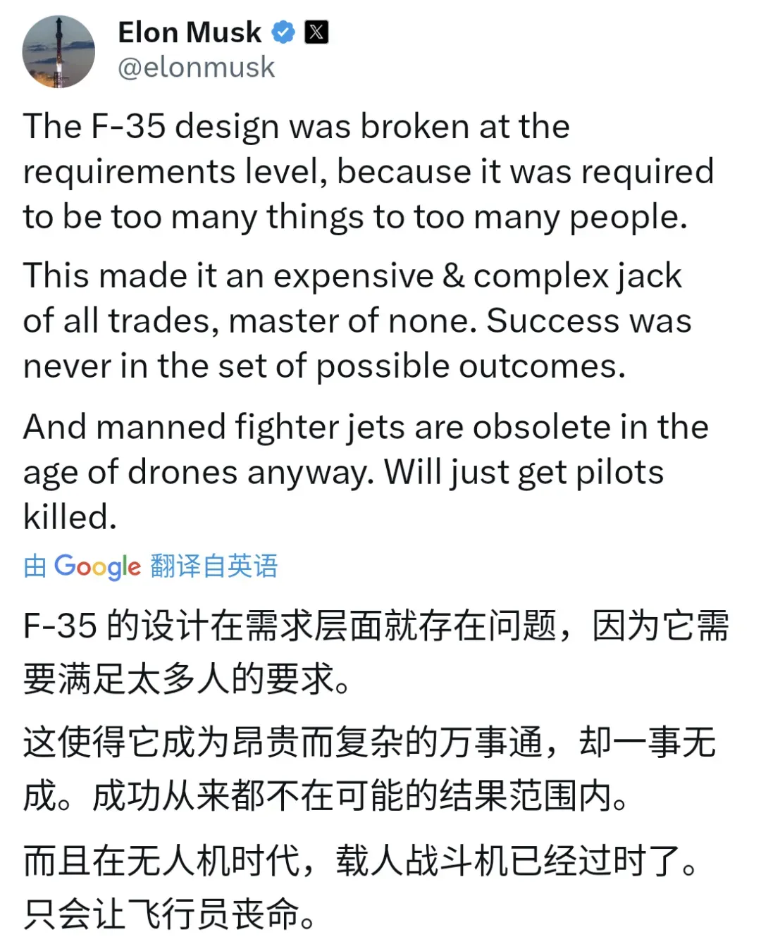 美帝國“一字並肩王”馬斯克,最近又在自己的社交媒體X上大發議論了,這次他瞄準的是美國空軍著名的F-35戰鬥機項目。