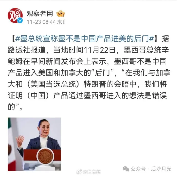 11月22日,辛鮑姆表示**,墨西哥不是中國產品進入美國和加拿大的“後門”!**