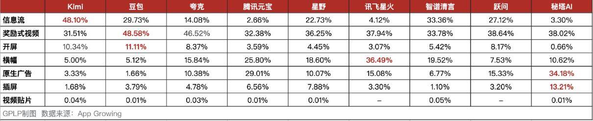 因為各家AI廠商在營銷策略上都有想法,各家挖金用的“鏟子”自然各式各樣,一方面體現的是各家AI公司在廣告形式上各有側重。