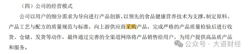 在公司2023年財報中有這樣的介紹,公司以用户的細分需求為導向進行產品創新,以領先的食品健康營養技術為支撐,制定原料、產品工藝與配方的質量規範與標準,向上遊供應商採購產品,完成嚴格的產品質量檢驗後進行收貨、倉儲、發貨等動作,最終通過完善的全渠道網絡將產品銷售給用户,為用户提供高品質產品和服務。