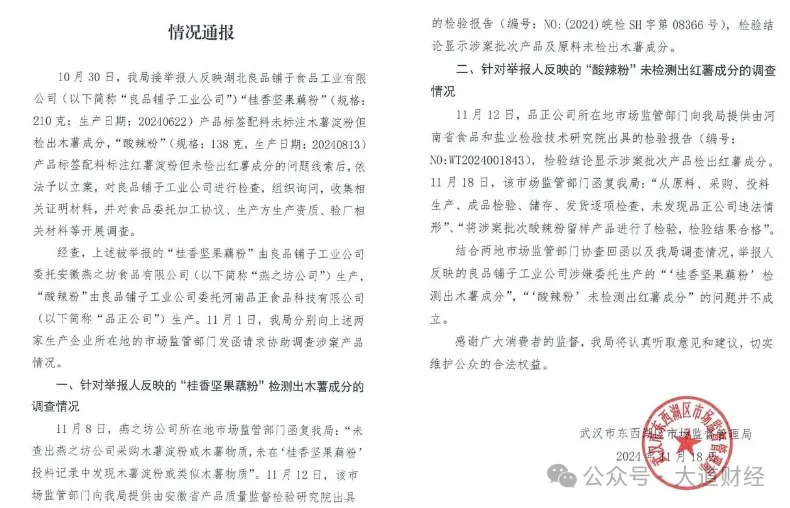 2024年11月4日,良品鋪子官方發佈公告表示,經初步排查,相關產品多批次送檢中各項指標均合格。11月4日, 武漢市場監管部門回應,已立案調查。11月18日,武漢市東西湖區市場監督管理局通報,舉報人反映的良品鋪子工業公司涉嫌委託生產的“桂香堅果藕粉”檢測出木薯成分,“酸辣粉”未檢測出紅薯成分的問題並不成立。11月18日晚,“松哥打虎”發佈微博回應稱,手裏有幾百個樣品,會繼續送檢。11月19日凌晨,良品鋪子在微博發佈澄清公告稱,將對打假網紅提起訴訟。同日,良品鋪子涉事“桂香堅果藕粉”和“酸辣粉”已重新上架,並被置於一個鏈接中。11月19日,兩位“打假人”發佈視頻表示:他們的檢測報告,來自海關,中間沒有任何人經手,所有報告全部來自海關官方檢測。