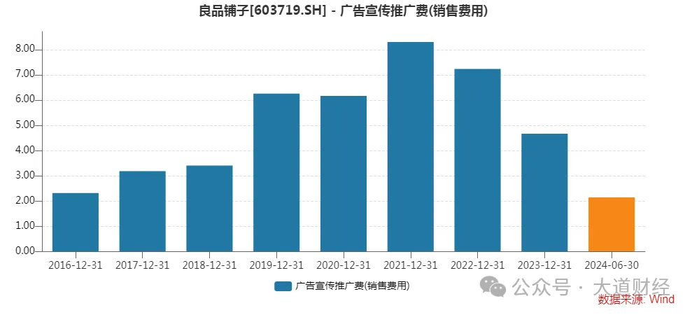 作為食品領域的高端零食股,廣告推廣必不可少。Wind顯示,2023年全年,良品鋪子的全年廣告費用為4.66億,在整個零食板塊排名第二,第一名是三隻松鼠約為7.78億。