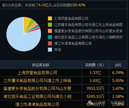 良品鋪子上市後沒再公佈公司前5名供應商的具體名字。但同花順數據顯示,在2019年6月30日,其前5大供應商分別是上海頂譽食品有限公司、江蘇驥洋食品有限公司與靖江市上味食品有限公司、福建愛鄉親食品股份有限公司與山東愛鄉親食、湖北旭樂食品工業有限公司與湖北小胡鴨商貿、靖江市津津食品有限公司(見下圖)。這五大供應商佔了採購總額的20.42%。