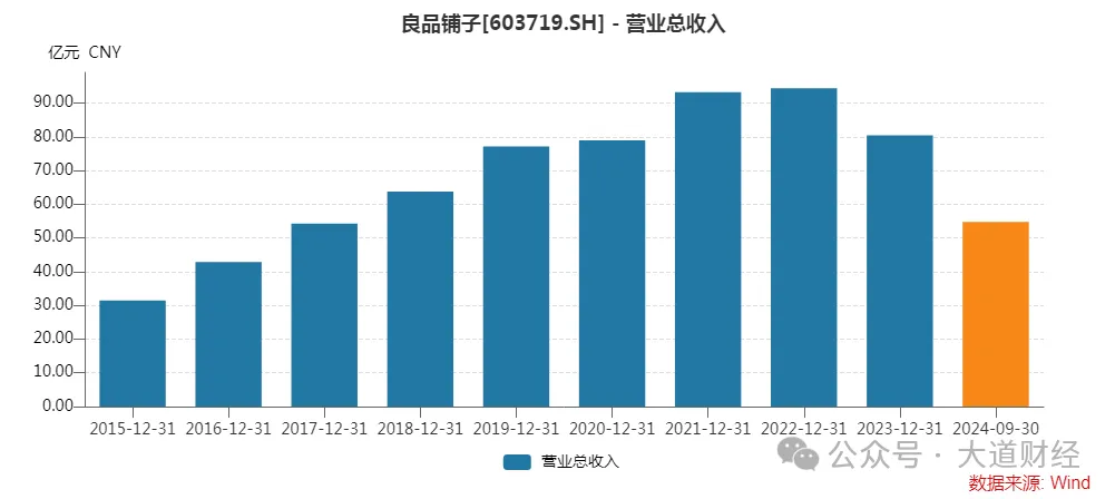 Wind數據顯示,從2015年至2023年以及2024年前三季度,公司營業收入分別為31.49億元、42.89億元、54.24億元、63.78億元、77.15億元、78.94億元、93.24億元、94.40億元、80.46億元、54.80億元。營業總收入在2023年開始下滑,當年的營收同比增長率為-14.76%。