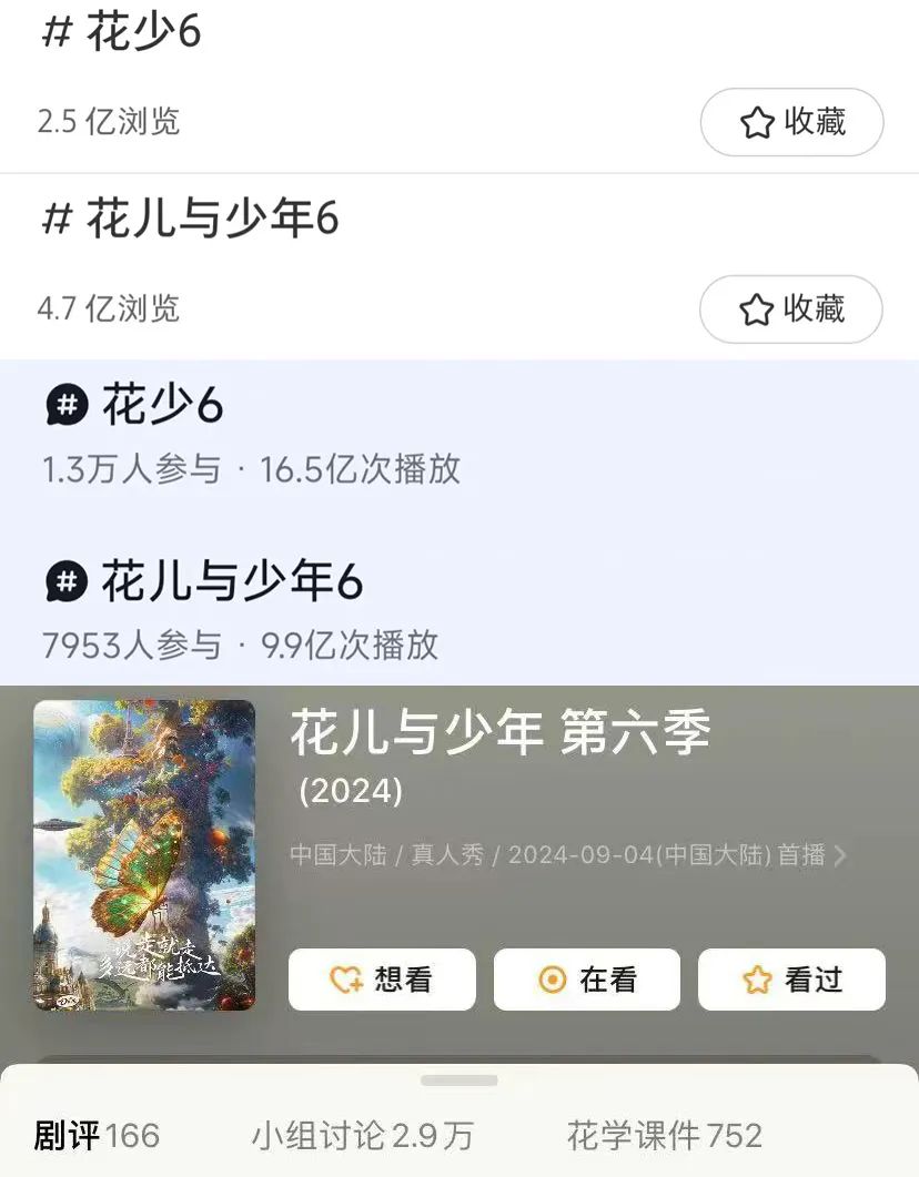 小紅書上,#花兒與少年6#相關話題瀏覽突破7億,抖音#花兒與少年6#相關話題播放量超過26億;豆瓣上《花少6》頁面甚至出現了《花學課件》專欄,750個《花學課件》正引起網友們細細地研討,他們紛紛在每個課件中蓋起高樓。