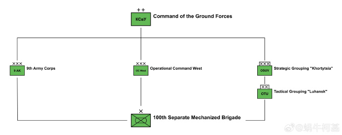 舉個例子,正如 ORBAT 所示,目前第100機械化旅同時接受三個單位的指揮:第9軍、西部作戰司令部和霍爾蒂察戰略大隊下屬的盧甘斯克戰術大隊。