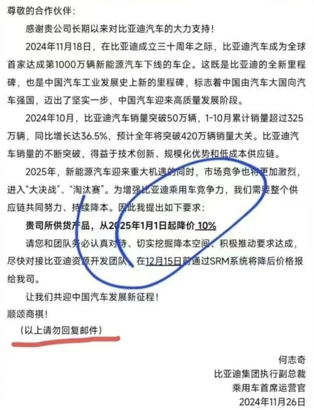 郵件大意:2025年行業進入大決戰,比亞迪需要整個供應鏈降本。故要求合作伙伴,從2025年1月1日起降價10%,並在今年12月15日前報價給比亞迪。