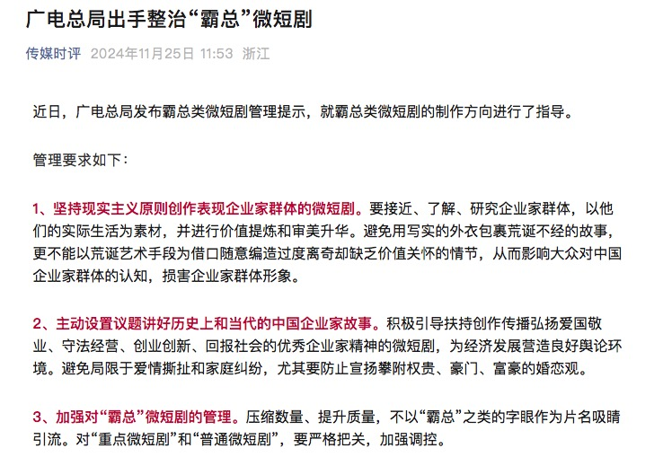 **最後,短劇市場雖然蓬勃但其野蠻生長的特質,也為長視頻平台留足了發展空間。**尤其是在這個短劇市場規範化、專業化和精品化的重要節點。畢竟短劇市場從不缺爆款內容被迫下架的品質問題,近日廣電總局更是出手整治“過度娛樂導向”的霸總短劇。