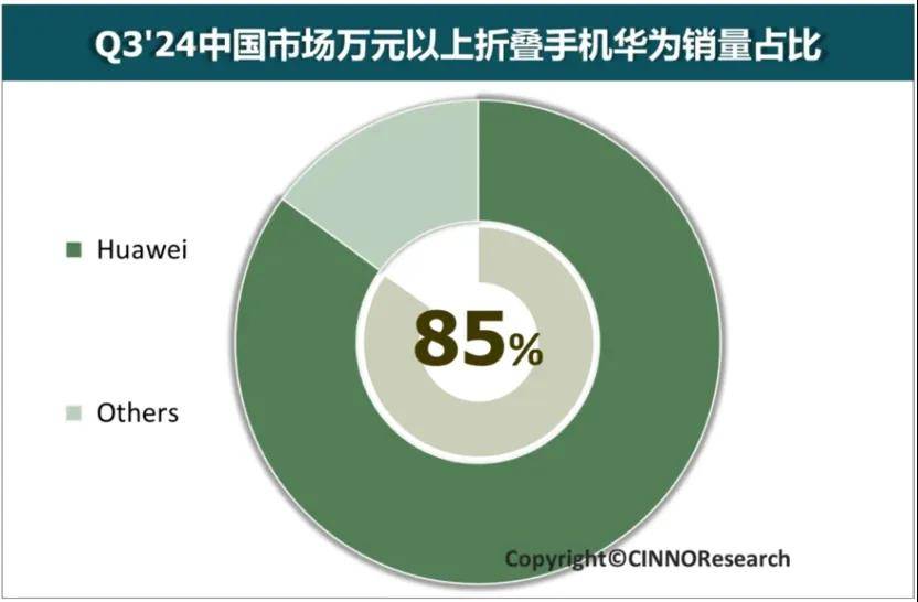 IDC數據顯示,2024年第三季度國內摺疊屏市場華為佔比高達41%,份額是第二名的約兩倍。CINNO Research最新數據,在真正萬元以上的“金線市場”,華為摺疊屏更是佔據了85%的市場份額,形成了高端市場“無對手”的絕對領跑優勢。