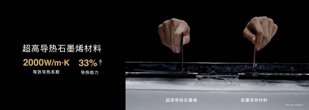 摺疊屏做得更薄,散熱就是問題,為了解決這個難題,華為研發了全新具備超高導熱性的石墨稀材料,等效導熱係數達2000W/m-K,導熱能力提升33%。這個超高導熱的材料,切冰可以像切豆腐一樣輕鬆。