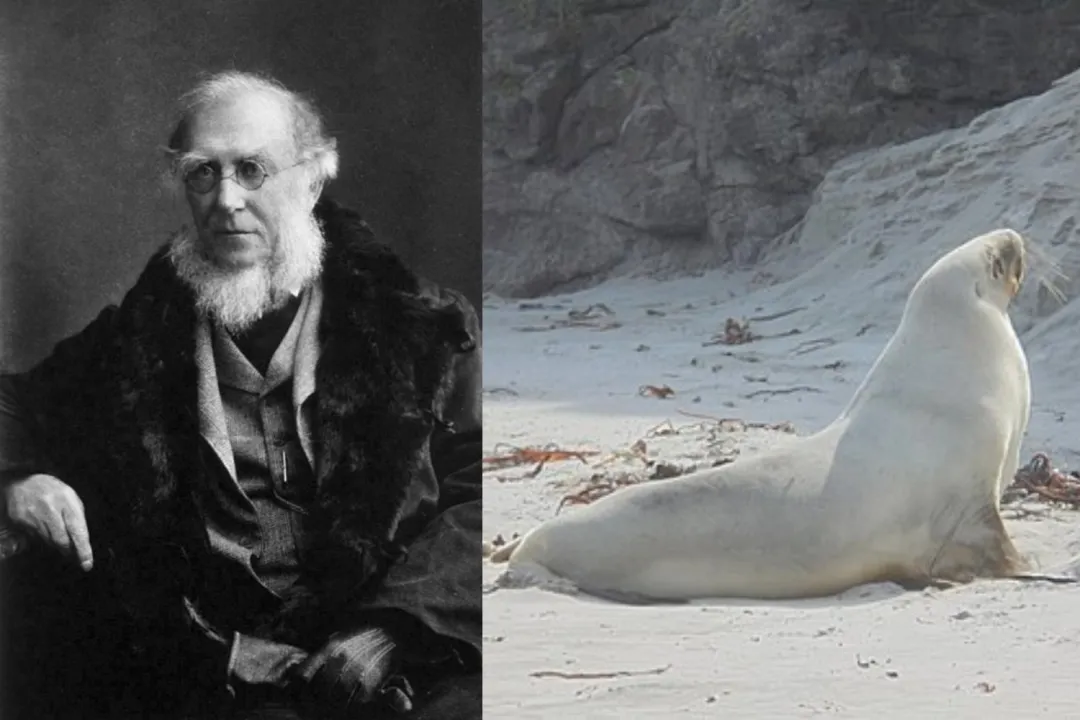胡克(左)是當時著名的冒險家、植物學家,也是“進化論之父”達爾文的摯友。達爾文正是在與胡克的通信之中,首次透露了自己關於“物種演化”的想法。《物種起源》也是在胡克的鼓勵下才最終出版發行。至少30多種生物以胡克的名字命名,包括胡氏海獅(右)(圖片來源:Wikimedia Commons)