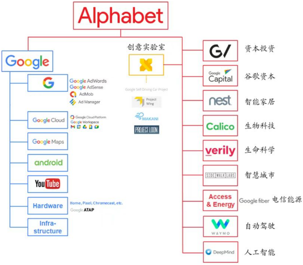 從收入構成上看,谷歌主營業務共分為谷歌服務、谷歌雲以及谷歌其他投資(人工智能、機器人、自動駕駛汽車、醫療)三部分;其中,谷歌服務又分為廣告業務和谷歌其他(Google Play、硬件、YouTube訂閲收入)兩部分。其中,廣告業務和雲業務為公司兩大核心業務。